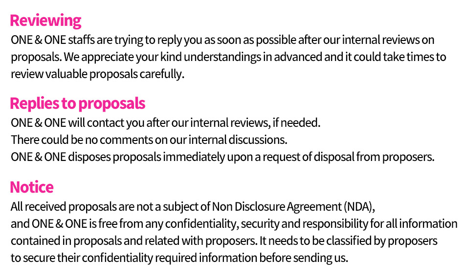 Please send your valuable proposals to our contact person. ONE & ONE will contact you after our internal review.